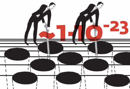 Есть даже «вероятностный» способ сосчитать саму константу. Во-первых, нужно запастись мешком иголок. Во-вторых, бросать их, не целясь, на пол, расчерченный мелом на полосы шириной в иглу. Потом, когда мешок опустеет, поделить число брошенных на количество тех, что пересекли меловые линии, — и получить π/2.